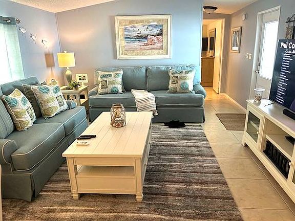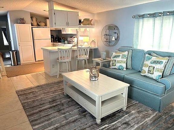 Move-in ready and tastefully furnished, this beautifully updated 2 bedroom, 2 bathroom home offers comfort, style, and peace of mind. 900 sq ft plus an additional 200 sq ft Florida Room. Upgrades include new fans, sinks, faucets, toilets, trim, and fresh paint, along with updated flooring throughout. The kitchen features a new 2023 refrigerator, and the home is protected with hurricane shutters for added security. Major improvements include a newer roof and gutters, new tie-downs, and a rubber roof over the Florida room. The AC was installed in 2009 and has been well maintained. Outside, you'll love the beautiful landscaping, covered carport, and a large storage shed. Located on a desirable perimeter lot, this home provides added privacy. Enjoy the benefits of low lot rent in a welcoming 55+ community. Just bring your suitcase-this one is ready for its new owner!