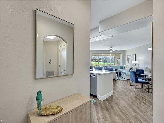 Tastefully remodeled, move-in-ready condo overlooks the 18th fairway from enclosed lanai. This light and bright home features elegant new furnishings, a neutral palette, stainless appliances, new ceiling fans, and hard surface floors throughout. The fully updated kitchen features island-height counters, soft-close cabinets, backsplash, and dry bar w/wine rack & storage. Laundry area has built-in cabinets & stacked appliances. The master bedroom has a large walk-in closet with built-ins. Guest bedroom has built-in closet for optimal storage. Bathrooms are updated with new fixtures, counters, cabinets, and more. The amenity-rich clubhouse features a variety of dining venues, indoor and outdoor sports bar with seating all around, and several TVs. Relax and socialize outdoors with seating around the fire pits near the resort style community pool. There are lighted tennis and bocce courts for your fitness and social enjoyment. Optional private Commons Club is available at add'l cost and includes a restaurant, state-of-the-art fitness center and spa, and lap pool. Spring Run is centrally located to fine dining, beaches, Naples, Ft. Myers/Sanibel and just minutes from Coconut Point Mall, SWFL Int'l Airport, FGCU and Hertz Arena.