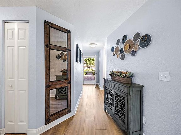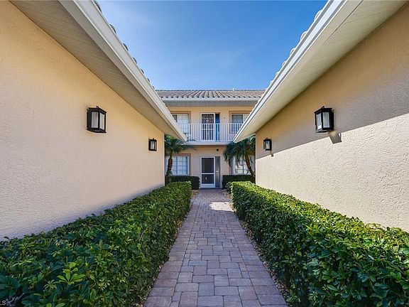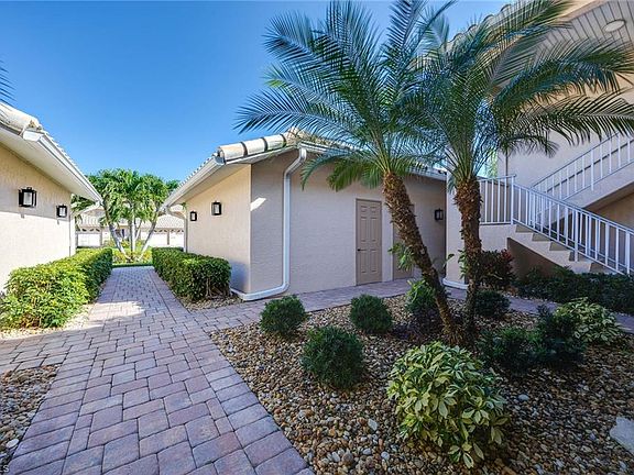 This home has been extensively renovated, with over $75,000 invested to create a sophisticated and contemporary living space. An open-concept great room is a welcoming environment. On the first floor, this unit provides direct walk-out access to the pool. The eat-in kitchen features a pantry, quartz countertops, wood cabinetry, and a subway tile backsplash, combining style with practicality. Large-format tile installed on the lanai creates an excellent setting for relaxation or entertaining guests. Quartz countertops are featured throughout for durable elegance. Luxury vinyl tile flooring in the living area and second bedroom provides a modern touch and offers simple upkeep and a sleek appearance. Plantation shutters ensure privacy while contributing a timeless look. Manual accordion storm shutters enhance protection. The primary bedroom is appointed with a king-sized bed and an en-suite bath. The bath is equipped with dual sinks, enhancing convenience. Berber carpeting adds comfort and aesthetic appeal. Owner will have the option to join the Players Club, allowing for flexible lifestyle preferences. Lely Resort is adjacent to restaurants and shopping and conveniently close to all the amenities, restaurants, shopping and beaches of Marco Island and downtown Naples.