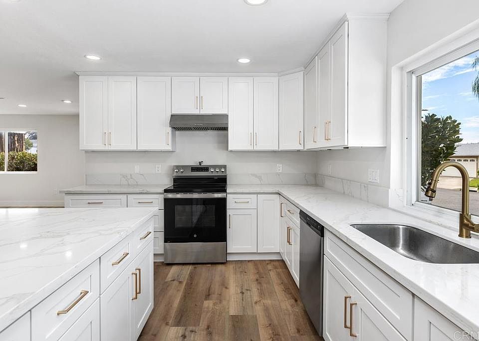 Welcome to 9022 Rupp Ct—where elegance meets comfort! This turnkey 4-bedroom, 3-bath home boasts a spacious open floor plan with luxury vinyl plank flooring throughout. The expansive primary suite includes a walk-in closet and direct access to the backyard. Enjoy year-round comfort with a brand-new high-efficiency AC/heat pump system and solar. The gourmet kitchen shines with an oversized island featuring Calcutta quartz counters, custom dovetail cabinetry, and recessed lighting that brightens the entire space. Each bathroom has been tastefully updated with modern finishes, and every room features new ceiling fans and fresh paint. Step through French doors from the living room or primary suite to your private backyard retreat, complete with a spa, fire pit, and a low-maintenance, drought-resistant landscape perfect for entertaining or relaxing. Santee offers it all — scenic hiking trails, beautiful parks, camping, and fishing. At the heart of the city is a sprawling 190-acre nature preserve, and you’re only 18 miles from the beach! Here, suburban comfort meets urban convenience, giving you the perfect blend of outdoor adventure and easy access to city life. This move-in-ready home is exactly what you’ve been waiting for!