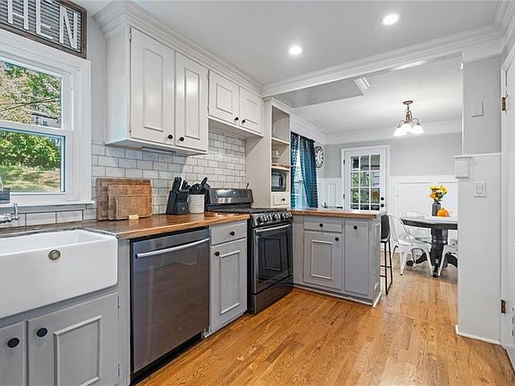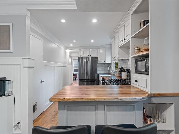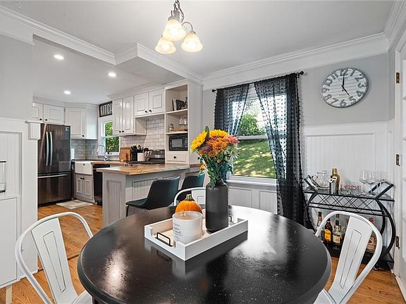 This beautifully maintained, updated & CLEAN 4-bedroom, 2-bath Cape Cod home, perfectly blends classic curb appeal with thoughtful updates. From the moment you arrive, you’ll fall in love with the inviting exterior featuring crisp white brick, black shutters, and a charming front entry framed by mature trees. Inside, the home offers a warm and welcoming atmosphere with spacious living area filled with natural light, a cozy fireplace, gleaming hardwood floors and gorgeous crown molding throughout every single room! The updated kitchen is a showstopper with modern finishes, display shelving, marble backsplash, 5 burner GAS stove, stainless side by side fridge, huge farmhouse sink & butcher block breakfast bar, with an easy flow into the dining area—ideal for both everyday living and entertaining.