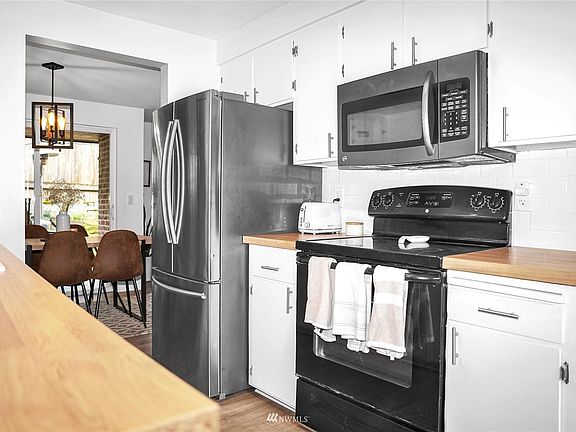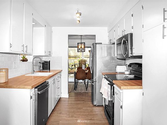 Tastefully updated, end-unit w/low dues in the heart of Edmonds! The updates to this townhouse-style condo over the last 2 years include new paint, trim & laminate flooring throughout, new carpet in the secondary bedroom, new light fixtures, new counters & tile backsplash, new faucet & sink, new fridge, washer & dryer. Other features include a spacious primary bedroom w/large walk-in closet & barn door, a wood burning fireplace, abundant storage, 2 reserved parking spots & large private yard space, w/patio, storage shed & firepit area. Low dues of $250/mo cover W/S/G & common areas. Located within minutes of downtown Edmonds, the waterfront, & access to I-5. With room under the rental cap, this property has investment potential as well!