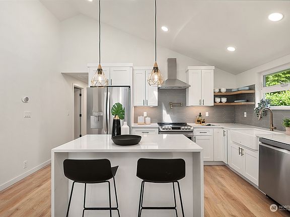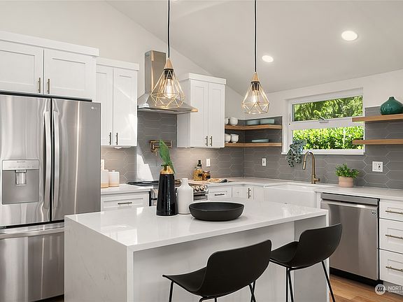 Modern mid-century boasts 3 bdrm 1.75 bth located on a corner lot in desirable Wedgwood! Extensively remodeled from head-to-toe, checking all the boxes! This home radiates warmth and ease of living all on one-level. New roof, new paint inside & out, new windows, new flooring, electrical updates & more! Entertainer’s dream kitchen w/ center island, floating shelves, custom farm sink & top quality appliances. Open concept living & dining room w/ wood-burning fireplace. Skylights welcome natural light. Converted bonus room perfect for play or hobbies. Private lot w/ yard and patio. Off-street driveway parking. The ideal location tucked away from it all on a great street while just min to coffee shops, restaurants & top-rated schools.
