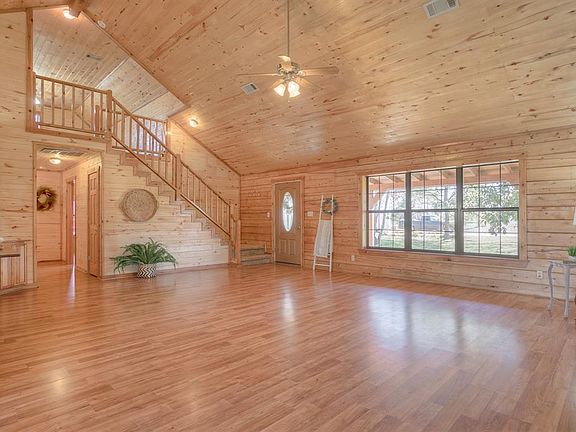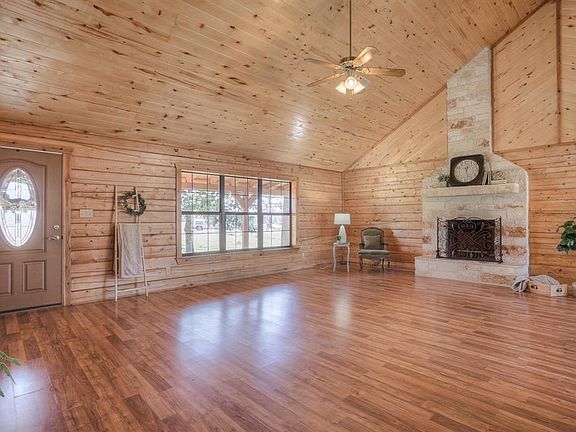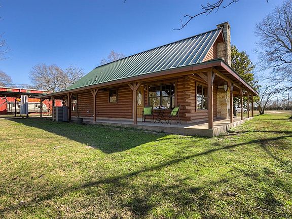 Extraordinary property features over 38 unrestricted rolling acres boasting a custom log cabin and a massive 5,000 square foot metal building with a connecting 50x50 airconditioned and insulated space with kitchen, an abundance of counterspace, and two bathrooms! The enclosed metal building and shop are flanked with two lean-tos. The log cabin is constructed with Oregon pine logs a metal roof and features 3 spacious bedrooms, 2 full baths, and a wraparound porch that offers serene views. The interior\'s open floor plan has been appointed with walls/ceilings of Aspen, floor to ceiling stone fireplace, spacious living and dining area, and a gourmet kitchen with Corian counters and an abundance of walnut cabinetry. Two car carport (with outdoor shower) sits next to the cabin. Smokehouse with propane tank. One additional pad site feature separate electric and well and another pad site features electric and septic. Numerous possibilities! Event venue, development, or leisure ranch!