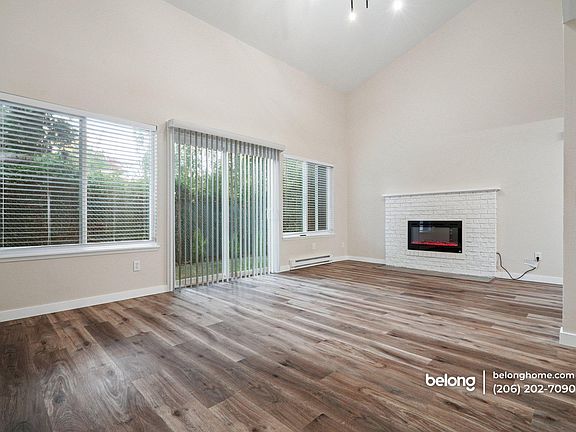 Vaulted ceilings, wide windows, and an open living area create a bright and airy welcome as soon as you walk in this gorgeous Seattle home! Natural light pours across the floors, while a white brick fireplace gives the room a stylish focal point for cozy evenings. Sliding glass doors open to your private patio, offering a smooth connection between indoors and outdoors.