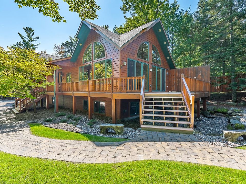 An exceptional opportunity on the prestigious Minocqua Chain, where 302 feet of shoreline ensures privacy and a peaceful natural setting. This beautifully crafted residence welcomes you with a paved path leading to a covered front porch and continues to impress inside with thoughtful design and upscale finishes throughout. The main living area showcases sweeping lake views and a dramatic fieldstone fireplace. The primary suite features a tray ceiling, walk-in closet, and spa-like bath with a custom tile shower. The english lower level offers a warm and inviting family room with fireplace and wet bar, plus two guest bedrooms and a full bath. Additional highlights include a 3-level elevator, smart security system, hardwood floors, knotty pine accents, custom millwork, expansive decks, meticulous landscaping, irrigation, permanent pier, new boat lift, boathouse with rooftop deck, attached garage, and a detached 3-car garage with a finished bonus room ideal for guests or office space.