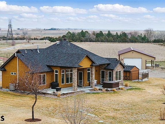 You don’t want to miss this amazing 8.15 acreage east of the hospital. Lots of natural light and open floor plan with tall ceilings, beautiful Brazilian walnut wood floors, formal dining, kitchen/living combo. Kitchen bar, deep pantry with auto lighting. Quartz countertops throughout. Primary bedroom has a tray ceiling, 2 walk-in closets, an entrance door to the covered patio & a full bath with 2 separate sinks. Guest bedroom has walk-in closet. 3rd bedroom has double door closet. Jack/Jill bathroom on the main in addition to another 1/2 bath. Fully finished basement with family room that includes a wet bar/beverage refrigerator, home theatre room w/tray ceiling and 2 bedrooms w/egress windows and a workout room. Nuvo sound system w/speakers on the main floor, workout room and patio. Covered patio with beautiful open views! Double car attached garage in addition to a 960 sq. ft. post frame building with concrete floor, 4 overhead door entrances and 1 walk-in door with a lean-to for all the toys/hobbies. Additional tool shed with pet door and fenced paved pet run attached. Lots and lots of trees on the border of this property. R/O system. Radon mitigation system. Washer/dryer excluded. Hot tub negotiable. 8.2 acres of water rights with Farmer’s Irrigation @ $35/acre annually.