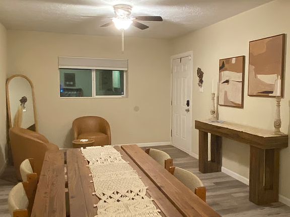 3 Bedroom and 2 Bathroom House. House is fully secure with ADT security system. Big living room, great for hosting friends or just enjoying a night in. Backyard has a 3 hole putt putt course. Court yard on side of house, great for hosting friends/family or a dinner outside. Living room has a pellet stove, nice for evening in. Pellets will be included. 2 Car garage or a 1 car garage with ping pong table. Dryer/Washer/Refrigerator included. House is located in uptown Albuquerque. Side yard access for a small trailer as well. Close to hospitals, parks, hiking, pickleball courts, basketball courts, and city life. This property is fully furnished and ready for your use.