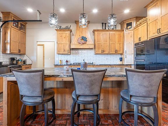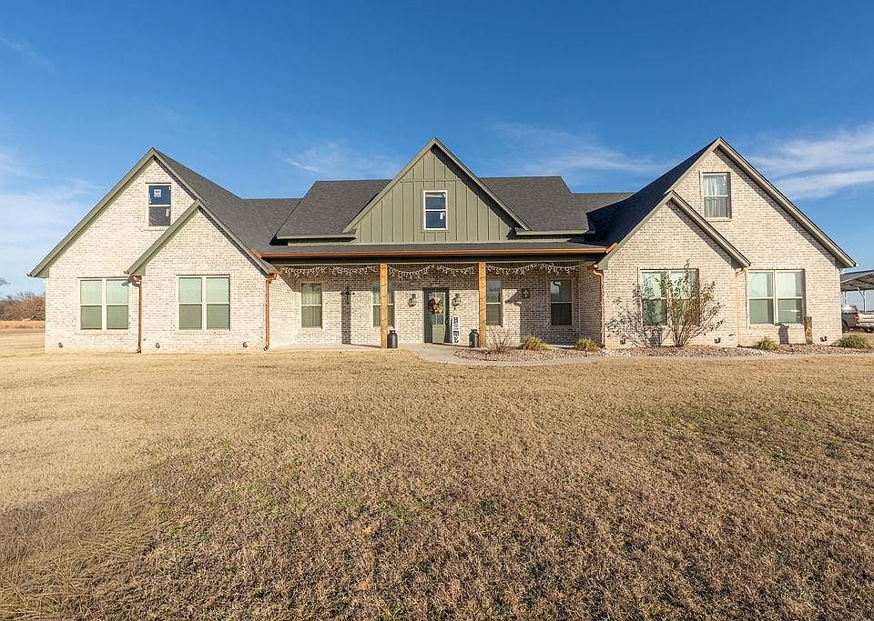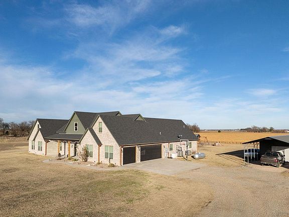 Prepare to enjoy this beautifully crafted 3700 plus sq ft home that rests upon 8.75 acres of land just northeast of Shawnee. As you pull into the driveway the copper guttering will catch your eye and you will begin to notice that this house is truly one of a kind. Walk in the home and discover the well thought out plan that includes 4 or 5 spacious bedrooms, 4 full baths, and multiple living areas. Enter the large kitchen area and take a look through the custom garage door style window that delivers a view of your nearly 9 acre property. Island seating, beautiful brick floors, chiseled edged, leathered granite fill the kitchen with a luxurious and custom feel. The formal dining area sits off of the kitchen and offers high ceilings for that large open area feel as well as seamless picture windows with remote blinds. The home comes with two ADA compliant primary suite options, one with a large custom soaking tub, walk in shower and double vanities. Continue through the house to discover a dog bath area, and a hidden bar. Walk upstairs, sit back an relax while you watch your favorite movie in the theatre room. The theatre room boasts a full closet and its own bathroom. Also included in the home is a Generac generator system, 220 v outlet on the back porch, floored storage room in the attic, oversized garage with 7.5 ft tall overhead doors, spray foam insulation and fiber optic internet. A covered back patio awaits you and your guests. The back patio area provides a spacious feel to grill, lounge and entertain. Outside the home is the 20x20 shop building, 20 x 26 attached carport with concrete floors and 110 electric with built in work bench. The east facing back porch along with the west facing front porch offer you the opportunity to watch the sunrise and sunset from your masterfully crafted home. Call today for a showing on this magnificent property.