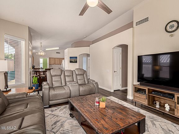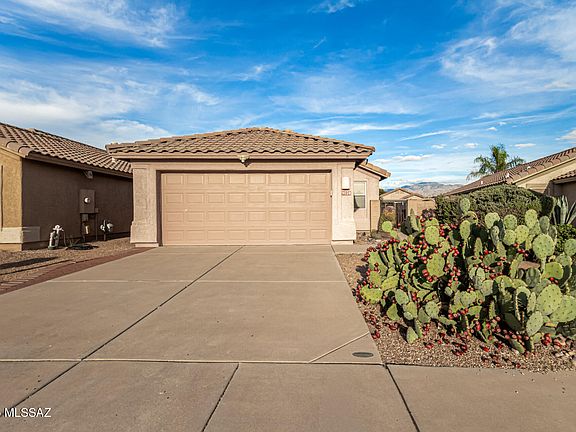 Welcome to this lovely home in desirable NW - The Bluffs II community. Open concept, high ceilings, eat in kitchen with breakfast bar, newer flooring, fresh paint in master, gated entrance with security door, nice size backyard, built ins in garage for storage, storage shed in rear yard, community park has playground, basketball court and horseshoe pit, close to shopping and Tucson loop.