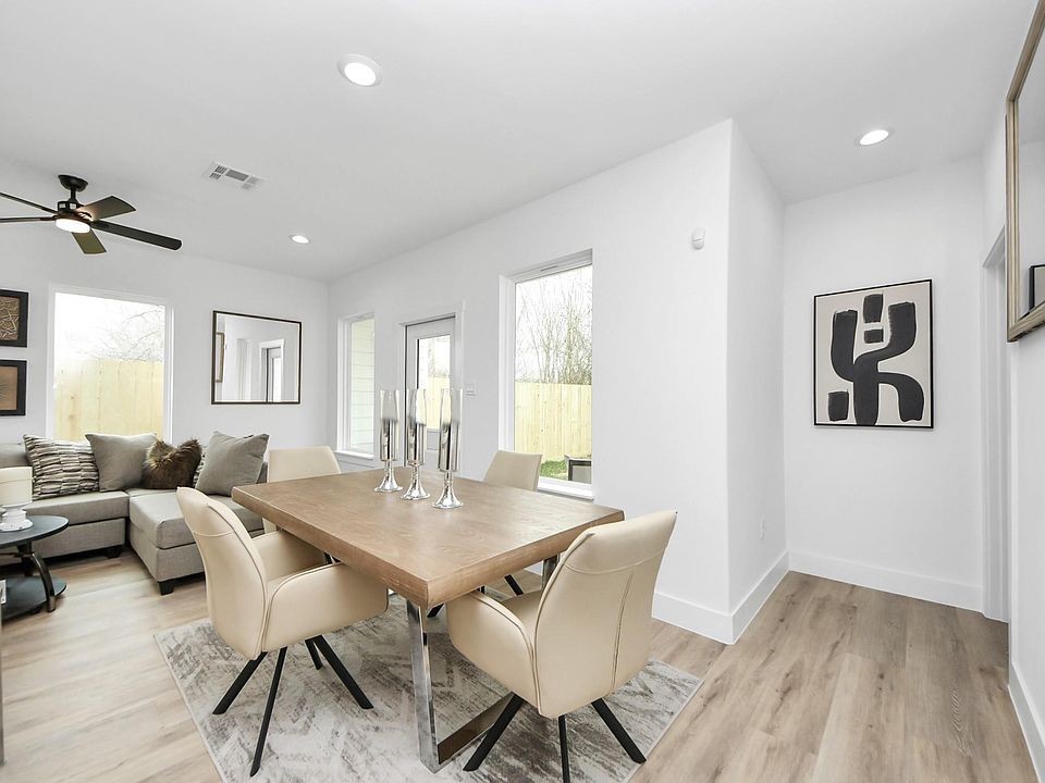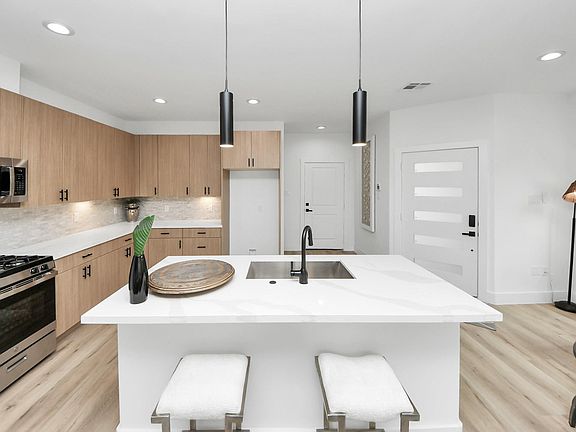 Modern luxury. Newly built home stands out as the largest new build house available in the area and is priced to sell. Located in the desirable Medical Center South subarea, this two-story gem has a sophisticated design and premium finishes. Spacious at 2,333 square feet, this home offers ample space for living and entertaining. Open concept living as the first floor has a seamless kitchen/family room combo, perfect for gatherings. Kitchen is equipped with sleek quartz countertops, an appliance package, and modern soft-close cabinets. Luxurious primary suite is an escape to your private upstairs retreat, a massive primary bedroom, a walk-in closet, and a private balcony. The en-suite primary bath includes double sinks and a separate shower. Thoughtful design allows you to enjoy the convenience of having all bedrooms upstairs, vinyl plank flooring throughout, and ceiling fans. Property includes a covered patio, a private yard with a fence, and an attached 2-car garage with an opener.