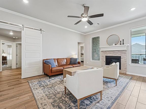 Enter into the welcoming and cozy living room with a gas fireplace, flowing seamlessly into the open kitchen with ample cabinet storage, large island and countertop seating—perfect for everyday living and entertaining. Modern touches like remote automated blinds add ease and convenience to your evenings at home.