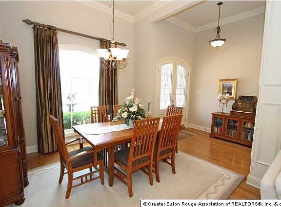Enter this elegant 6 year old home through the double leaded glass front doors. The 12' ceilings have stacked crown molding, and wood floors from the foyer through the dining room into the living room. From the dining room front wood window you can enjoy the large fountain on the front of the house. The living room has a stunning fireplace mantle featuring gas logs and plenty of space an entertainment armoir (plus a connection for TV is over the mantle). The wall of windows overlooks the patio and landscaped yard. Ceramic tile floors in the kitchen, breakfast room and hallway to the mother-in-law suite. The kitchen features cypress cabinets, a large island with built-in shelving, slab granite counter, and a raised breakfast bar. The kitchen also features ceramic tile counters and backsplash with granite tile inserts, stainless steel appliances, gas cooktop, & walk-in pantry. The large breakfast area has windows on all sides - such a light, bright home with low utility bills due to the added foam insulation in attic! The wonderful wetbar with ceramic tile counter, glass front cabinet w/glass shelves and ice maker has a large arched opening to the dining room for easy serving. All bedrooms have walk-in closets. The spacious master bedroom has a wall of windows overlooking the backyard. The master bath has ceramic tile floors and counters, framed mirror, large his and her vanities, corner jetted tub, large separate shower with ceramic tile floor, linen closet plus large wrap around closet with built-ins. The triple split floorplan affords privacy for everyone! The large laundry has storage, cabinets, & ceramic tile counters. Oil rubbed bronze light fixtures, crown molding, and faux plantation blinds throughout the house, as well as speakers in every room & lots of storage closets in hallways!! The storage room in the garage has a work bench and a storage cabinet.The home comes with a security system and Open Cell Insulation - reducing energy costs by 50%!