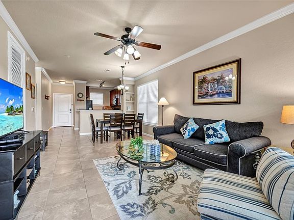 Beautifully furnished Italian-Mediterranean style 2-bedroom, 2-bath condo, fully upgraded with 16" tile in the main living areas, carpet in the bedrooms, granite countertops in both kitchen and bathrooms, cherry wood cabinetry, and crown molding throughout. Each bedroom has its own private full bathroom for maximum comfort and convenience. This top-floor unit features a covered balcony with relaxing south-facing pool views. Bella Piazza is zoned for both residential and short-term rental use, making it an excellent investment opportunity, second home, or permanent residence. Resort-style amenities include two community pools, a kiddie pool with water playground, fitness center, business center, game room, BBQ area, and on-site management. Conveniently located just steps from dining, groceries, and shopping at Berry Town Center, and only 10 minutes from Disney. Move-in ready—ideal as a vacation getaway, short-term rental, or your new home in the sunshine.