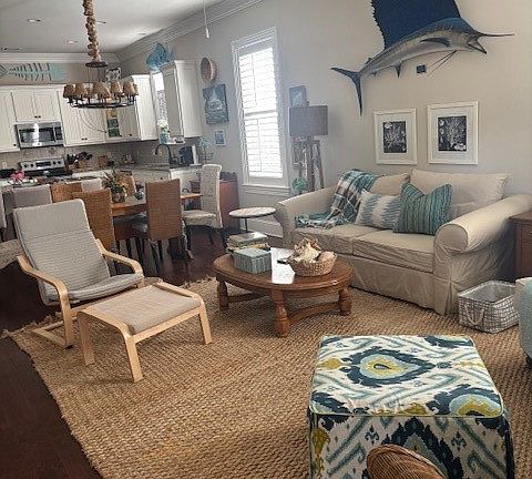 A home on sought after Fort King George Drive. Expansive views of the marshes along the Darien River, the Butler Plantation rice fields of days gone by, and the charm of a Southern Low Country Cottage make this beauty a desirable home. The Holly Grove, Southern Living Plan with the tweaks of an owner designer and a local premier builder, Bill Bailey, are readily apparent in this high-end construction. The home is built among other high-end cottage designs and a canopy of majestic oaks & moss. A 200 square foot year-round porch was added at the rear of the home to capture the views, the sunrises & sunsets - simply the mystique of God’s beautiful creation. The house is raised over a crawl space, easily accessible. It is well insulated with foam insulation under the house, in the house walls and the house attic. The attic is partially floored for storage. A drop-down entry is conveniently located in the hallway to the bedrooms and baths. The beautiful large windows all around the house don operational two-inch cypress shutters. House is built & strapped to hurricane specifications. To maximize space, the cottage is built shotgun style with an open concept. Entry off a wonderful front porch, with dark gray floors and a haint blue ceiling, welcomes you into the owner/designer’s home filled with invitation and warmth. The room extends to the back of the house, each living area providing its own distinction. The ten foot ceilings, transoms above the doors, the wood flooring, and beautiful crown molding exude high-end design and product. The kitchen cabinetry as seen in the photos complements the southern design. Countertops throughout the cottage are granite. Designer-detail in borrowing space provides attractive hallway linen space or showcase shelving. Every crook and cranny are used. The two bedrooms and bathrooms to the left off the living area are roomy. Both bedrooms have wonderfully large windows; the back bedroom provides a view of the marsh. Both rooms have a double door closet and as a bonus, storage space above the closets with separate doors. One bathroom has a step-in, roomy shower and the other a bathtub/shower. Both have transom-style windows above providing lots of outside light. Each bath is tastefully designed with complimentary hard surfaces and floor tile. Beadboard accentuates the southern cottage décor. There is a spacious utility room between the kitchen & and the year round porch. A must see. Home is shown by appointment only. Owner occupied.