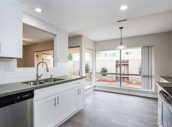 A charming completely remodeled single story two bedroom two bathroom condominium with 1140 square feet of living space. The remodeled kitchen boasts white shaker cabinets, beautiful stone counter tops, and all new appliances. Wood laminate floors installed in the living areas are clean and elegant with the bedrooms having plush carpet. Two spacious bedrooms ensure plenty of comfort with the master bedroom also offering a dressing area. The dressing area includes dual vanity and oversized additional storage. There is a private patio with freshly installed landscaping as well as dedicated laundry for the unit just outside the master bedroom. Dedicated parking, permit based parking, and street based parking are all available for this beautifully remodeled condominium.