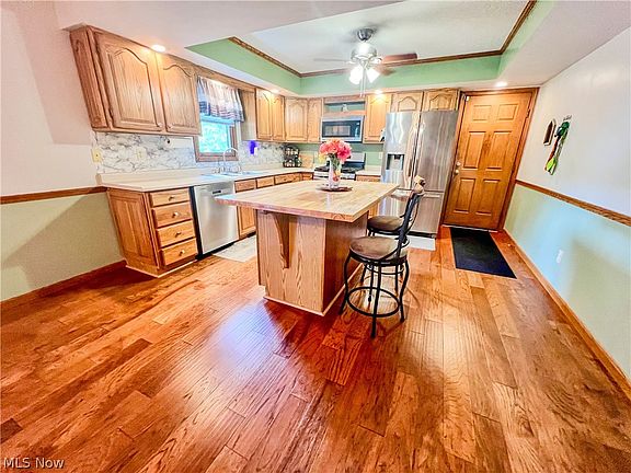 Welcome to your dream home! This exceptionally well-constructed brick residence situated in a highly desirable neighborhood features 3 bedrooms, 2 full bathrooms, 2 car garage, 200 AMP electrical service, vaulted ceiling, full basement, two distinct locations for laundry facilities—one on the main level, and another in the basement, and a wraparound deck. The spacious eat-in kitchen is outfitted with newer modern stainless-steel appliances, elegant oak cabinetry, an island with a butcher block countertop, and sliding glass doors leading to the deck. The two-car garage provides additional storage space or a workshop! The clean, and dry basement includes a recreational room and ample storage space! **: Proximity to essential amenities, being only five minutes from shopping centers, downtown, and a healthcare facility. A covered back deck exhibits serene views. This residence is meticulously designed for comfort and convenience, providing the option for one-floor living with the primary bedroom, a full bathroom, laundry room, and garage all situated on the main level.