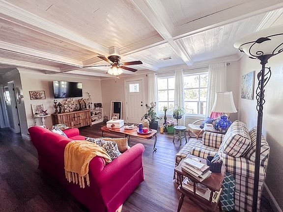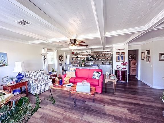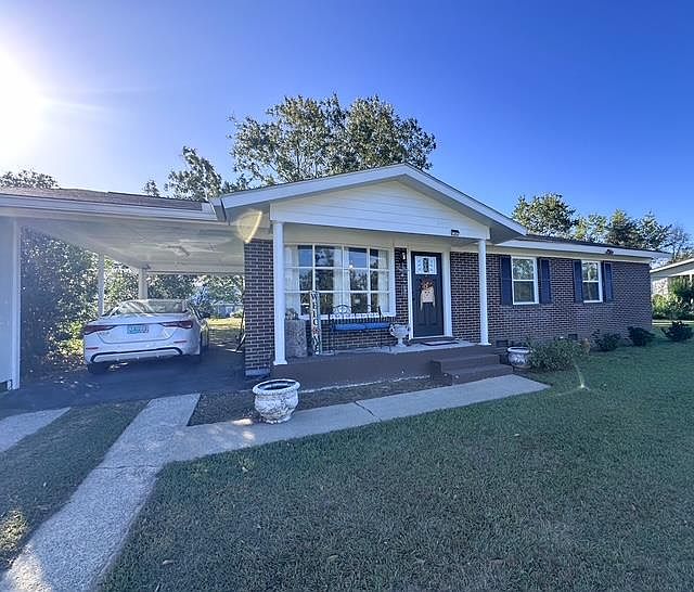 This charming 3 bed, 2 bath brick ranch features a stylish open-concept layout with a spacious living, dining, and kitchen area. The kitchen is a showstopper with a huge island, stainless steel appliances, trendy open shelving, and modern finishes throughout. A gorgeous, coffered ceiling ties the whole living space together. The split floor plan offers two comfortable guest bedrooms and a beautifully updated hall bath, while a private master addition at the back of the home provides a peaceful retreat with its own en suite bath and walk-in closet. Outside, you'll find a single carport, a storage shed, and plenty of curb appeal. Every detail has been thoughtfully updated--this one is ready to welcome you home!