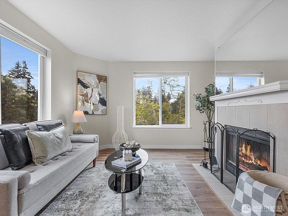 **Urban Living at Its Finest!** This stunning upper-level corner condo offers exceptional natural light and breathtaking views of the Cascades and Seattle skyline. LVP floors flow throughout the main level, featuring a spacious living room with a gorgeous wood-burning fireplace. The stylish kitchen boasts new appliances, an eating bar, and a large pantry closet. A unique spiral staircase leads to the upper level with a primary bedroom, two closets, a second bedroom, and a full bath with stackable W/D. Garage Parking! Steps from the Interurban Trail, coffee shops, and Light Rail for easy commuting!