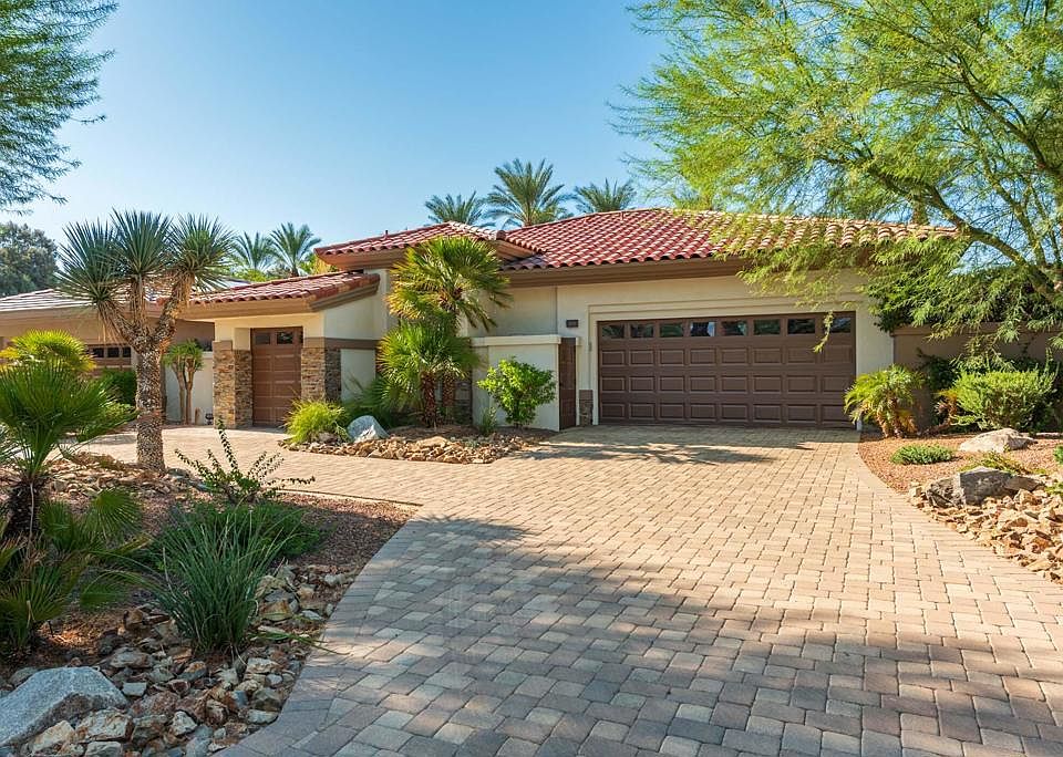 Step into refined desert living with this beautifully redesigned Smoke Tree 2 model, ideally positioned to capture sweeping southern views of the lake, mountains, and Grove Course #6. This bright and airy home boasts an open-concept layout creating an expansive flow between living and dining areas. Tucked away in a peaceful location set back from the fairway, the property offers a private oasis complete with a saltwater pool and spa, cascading water features, built-in BBQ, and an upgraded electric awning with pergola for added shade and comfort. Perfect for entertaining or relaxing under the sun. Interior upgrades include new electric shades, recessed lighting, elegant paver stonework, and a custom golf cart garage. The neutral flooring throughout is complemented by plush carpeting in the bedrooms. Enjoy seamless indoor-outdoor living, with direct patio access from all main living areas. A cozy fireplace and full bar elevate the living room ambiance, while the updated kitchen features a stylish bar-height counter and modern cabinetry. The spacious primary suite offers two generous walk-in closets, and the ensuite bath includes dual vanities, a jetted soaking tub, and a separate walk-in shower. Both guest bedrooms are ensuite as well, providing a comfortable and private retreat for visitors. Additional features include a two-car garage plus a separate, custom-built golf cart garage with epoxy floors. Pavers enhance the curb appeal and continue through the front courtyard and backyard entertaining area. Club Membership is available to the buyer.