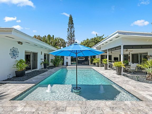 Stunning Mid-Century Modern Gem in Desirable Chapel Hill. This beautifully restored 3-bedroom, 2-bath home seamlessly blends modern updates with timeless mid-century charm. Spanning over 2,500 sq. ft., this rare find boasts original terrazzo flooring, vaulted wood beam ceilings, and a Palm Springs-style pool and patio--perfect for effortless indoor-outdoor living. Expansive hurricane-rated windows and sliders fill the home with natural light, offering seamless access to the lush, professionally landscaped corner lot--a private tropical oasis surrounded by mature plantings.Inside, the chic gourmet kitchen showcases state-of-the-art appliances and extends into a stylish breakfast area with custom cabinetry. The spacious living and family rooms feature soaring wood ceilings, addng to the home's vintage appeal.