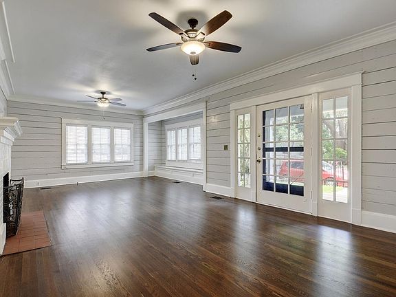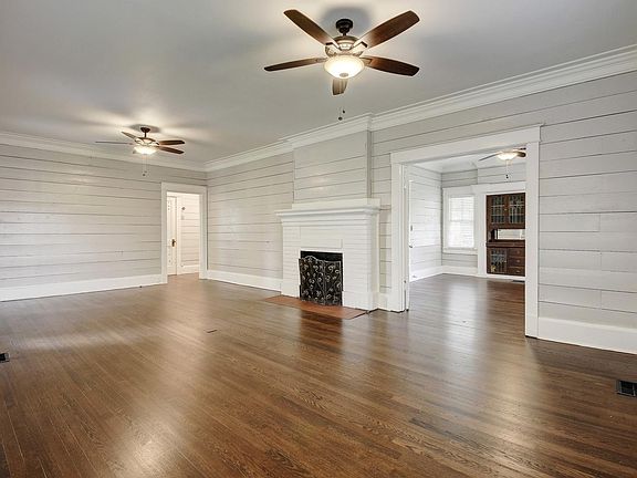 This charming property features original hardwood floors, abundant natural light, and a spacious living area with a fireplace and mounted 70" TV. The main level includes four bedrooms, one bathroom, a kitchen, and a laundry area with a stackable washer and dryer. Upstairs, the finished attic offers a large fifth bedroom with its own private bathroom and mini-split A/C unit.