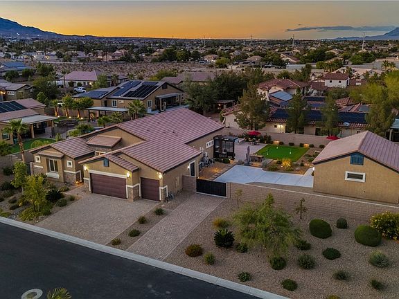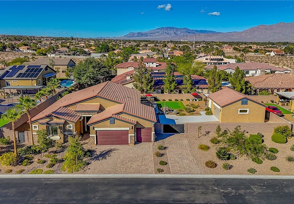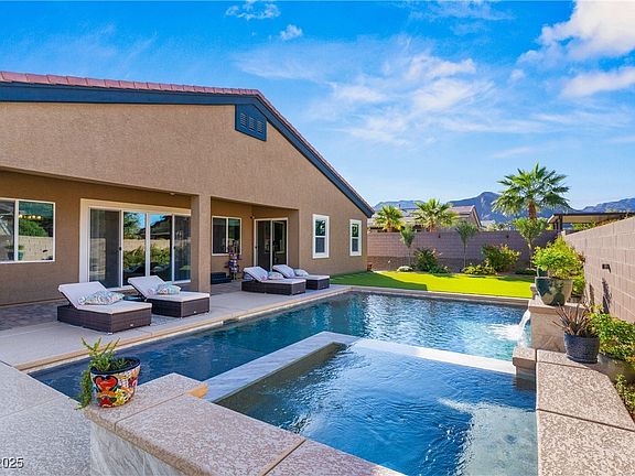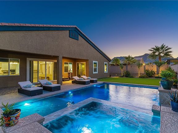 Discover your private oasis in the heart of Lone Mountain. This elegant single-story home blends luxury and livability on nearly ½ acre of beautifully designed space. A gated drive leads to RV parking with full hookups. Inside, high ceilings, wood-look tile floors, and an open, sunlit great room create a warm welcome. The gourmet kitchen impresses with granite counters, a huge island, stainless appliances, gas cooktop with pot filler, and walk-in pantry. Retreat to the primary suite with backyard access, dual closets, and spa-inspired bath featuring soaking tub and oversized shower. Outdoors, enjoy your resort-style yard surrounded by mature, manicured landscaping with sparkling saltwater pool, bubbling spa, mountain views, putting green, and lush synthetic lawn. A fully finished 800 sq ft outbuilding—heated, cooled, and plumbed—offers endless potential as a workshop, studio, or guest retreat. This is the perfect blend of comfort, style, and space in one exceptional Las Vegas home.