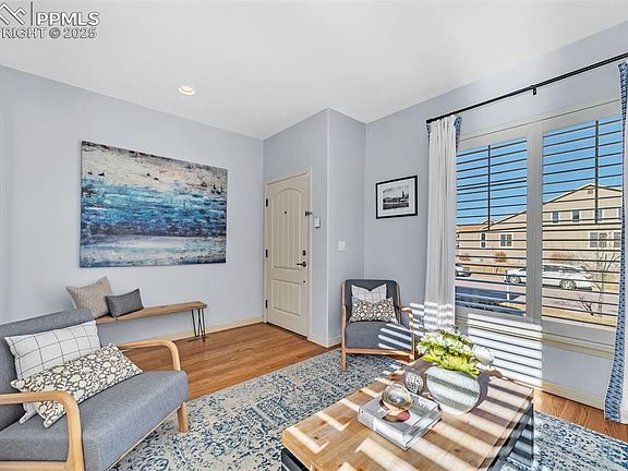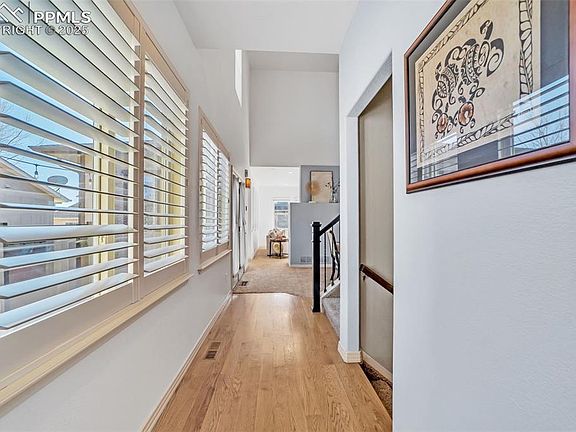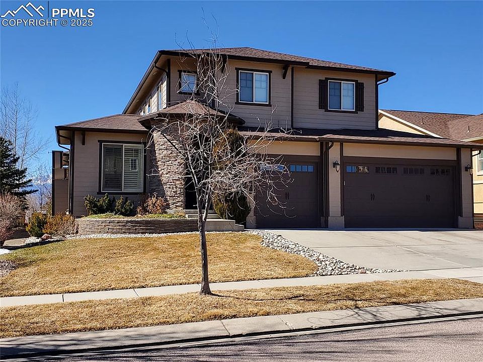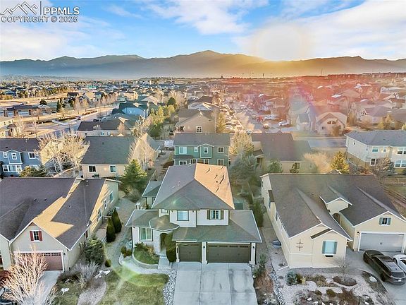 This is a very special house with some wonderful unique features that you won't find anywhere else, and it has everything you are looking for! Check out the second photo, an aerial shot showing the lot and the roof line up directly with Pikes Peak, amazing! All included on the main level, there is a formal living room and dining room, a family room/great room, an office with full bath that could be made into main level bedroom, and an extra large eat-in kitchen with an addition that includes 2nd sink, 2nd fridge, extra cabinet and counter space, laundry room and mud room with storage galore! Extensive kitchen upgrades include quartz, 4 inch hardwood floors, stainless gas cook top, double ovens, and updated knotty maple cabinets with crown molding. Wired for surround sound in family room/great room. There is a private patio with an outdoor gas fireplace off the dining room. Open floorplan has gorgeous 18 foot vaulted ceilings open to the upper level. Main and upper levels have fresh new paint in perfect up to date color. Large bedrooms! Master bedroom has coffered ceiling with custom wood paneling and a mountain view. Master bath has large double shower, double shower heads, oval soaking tub, separate double vanities, and walk in closet. Custom tile work in all bathrooms. Hall bath has double vanity. Downstairs has 9 ft ceilings, 2nd family room/media room with rough in for wet bar, and 2 more bedrooms with full bath. Extra large 3 car garage with storage and new workshop with built in cabinets. Outside the kitchen along the back of the house there is a 30 x 15 colored and stamped concrete patio with gas line. Beautifully manicured professional landscaping. Stone turret front patio entry. Great neighborhood in D20 within walking distance to Gateway Park pond and waterfall. Close to schools, shopping, and conveniently located with easy access to all military bases. Close to Powers corridor. This home is better than new and is a must see!