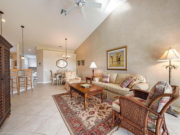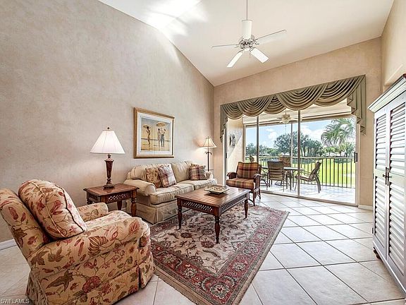 GOLF COURSE & LAKE VIEWS from tiled lanai that also has an electric hurricane shutter for quick protection & safety! This 2nd floor Heather model has MANY UPDATES including: wood kitchen cabinetry, exquisite GRANITE counters & tile backsplash, 2021 all stainless appliances, water heater, toilets, and 2018 AC UNIT. This open, airy & bright condo has LARGE TILE ON DIAGONAL in all common areas, vaulted ceiling in great room, pull-out sofa, new carpets 2022 in master & guest bedrooms and entry stairway! Master Bedroom has a large tiled walk-in closet and Water Closet with wall cabinet & wood detail. Guest bedroom has crown molding. Spring Run is a financially stable, BUNDLED 18 hole golf community with newly remodeled clubhouse, restaurant, bar, Fitness room, tennis & bocce, more! PRIVATE BEACH CLUB available. Centrally located to Naples, Ft Myers/Sanibel. Min away from Coconut Pt Mall, 20 min to beaches, SW Int'l Airport, fine dining, shopping, Miromar Outlets, Gulf Coast Town Cntr, Germain Arena, FGCU.