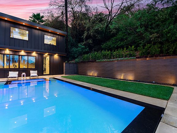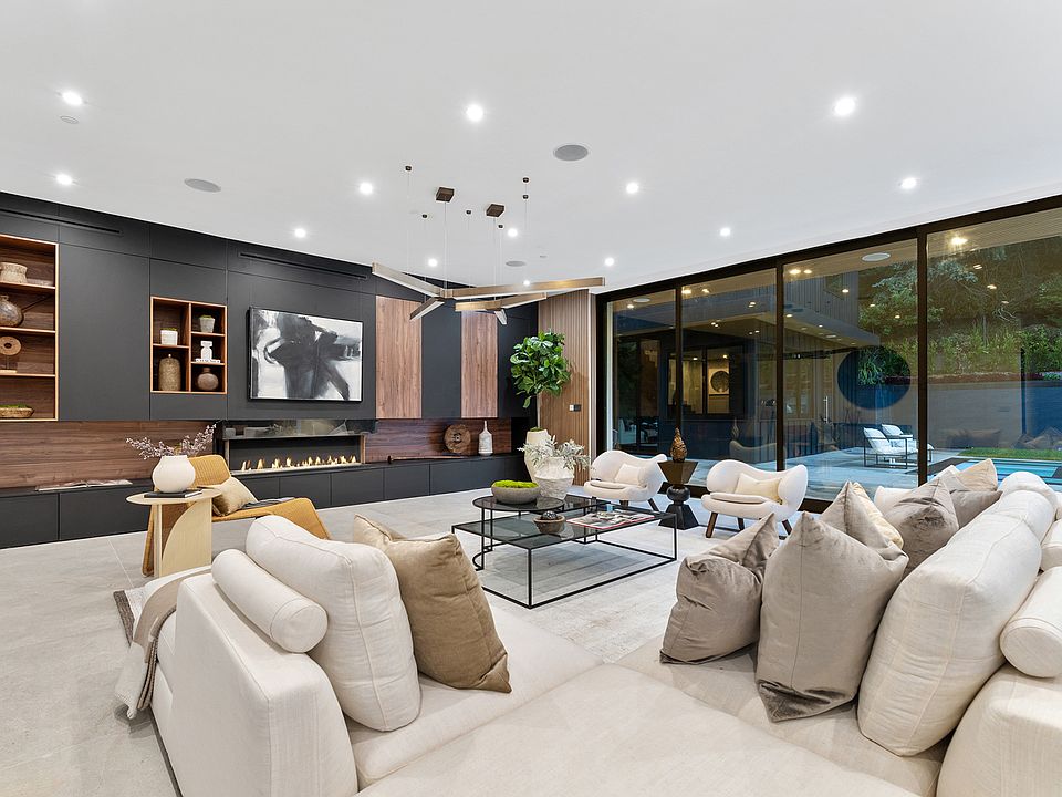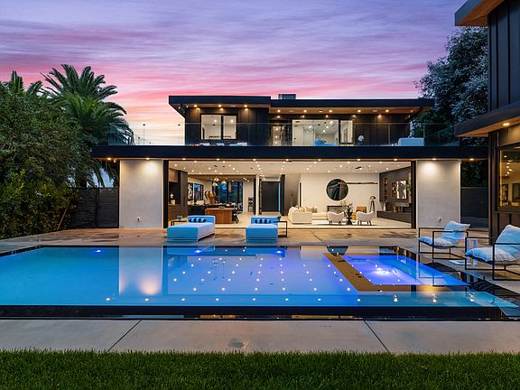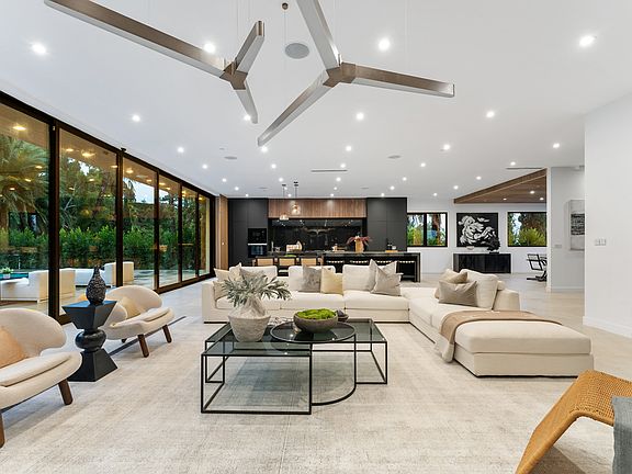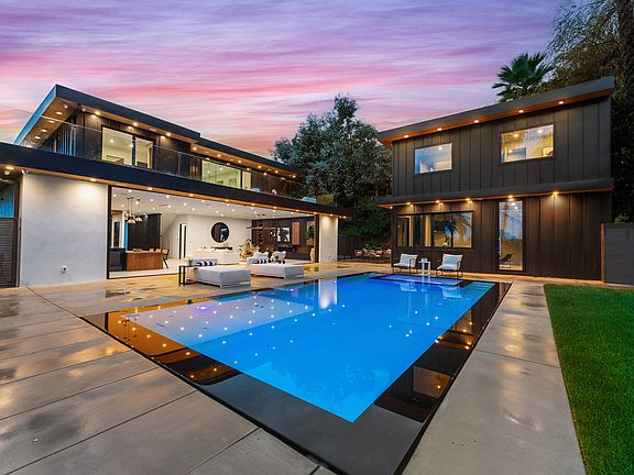 Fully furnished and turnkey! Exhibit your sense of style in this fashionably designed and impeccably appointed, modern 5 bedroom Beverly Hills entertainer's dream. Step past the gates and front door into the open plan living space with its large gourmet kitchen, formal dining area and great room. The kitchen features a large island with multiple seating areas and custom cabinetry. The formal dining area is trimmed with a hardwood ceiling and large glass storage wall. The great room includes a fireplace, cabinet wall, modern chandelier, and nearly full width floor to ceiling retractable glass wall for whole house access to the rear deck and copious amounts of natural light. The main level outdoor deck includes multiple seating areas, a large pool and spa, lush privacy landscaping, and lawn with its seamless connection to the living areas make an impressively large indoor outdoor entertaining area. The entire living space is dynamically furnished and trimmed in black and natural wood, a theme that carries over to the outside of the detached ADU guest house. The upper level features four guest rooms, highlighted by the sparkling primary suite with its large walk-in closet with custom shelving, and spa-like bath with dual basins and large walk-in wet area with multiple shower heads and soaking tub behind glass. A 180-degree wrap around balcony and garage-top deck add outdoor lounge amenities to the upper level. A 2 story guest house includes a kitchenette, living area, and powder room on the main floor and sleeping chamber, bath, and office on the upper level, which can be converted into a 6th bedroom. Newly remodeled ground up and ideally situated in the exclusive Trousdale Estates enclave, you will be minutes away from the Golden Triangle and West Hollywood and all the best dining, shopping, and entertainment the city has to offer.