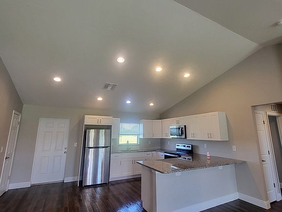 Welcome to your new home! This spacious 4 bedroom 2 bathroom home is perfect for entertaining! Large back yard in a peaceful neighborhood. The kitchen features stainless steel appliances, a large walk in pantry, and an extended countertop peninsula with plenty of seating. Luxury Vinyl flooring, no carpet! New interior paint. Tall cathedral ceilings in the living room for a dramatic entrance. Lawncare is included