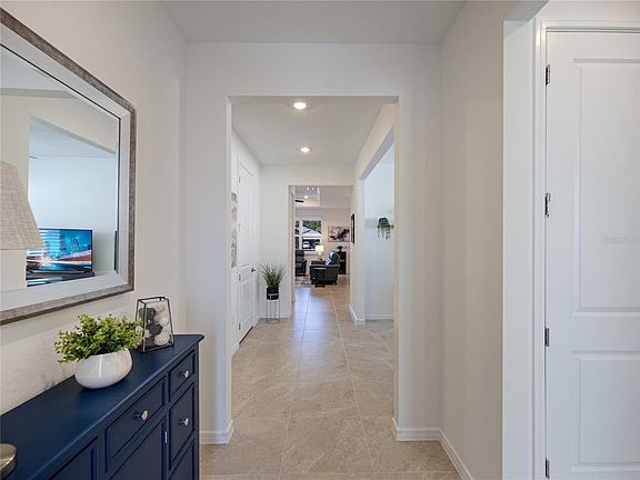 Welcome to this practically new 2024 Prosperity model in the highly sought-after 55+ community of Del Webb Stone Creek. This beautifully upgraded 2-bedroom, 2-bath home with a versatile flex room offers the perfect blend of comfort, style, and low-maintenance living. Step inside to find all-tile flooring throughout, creating a seamless and elegant flow. The light-filled living area features a tray ceiling and plantation shutters, adding an elegant touch. The upgraded gourmet kitchen boasts quartz countertops, enhanced cabinetry with crown molding, and modern finishes that make cooking and entertaining a joy. The primary suite feels like a private retreat with its large zero-entry walk-in shower, beautifully tiled for a spa-like experience. Both bathrooms showcase tastefully tiled showers and contemporary design. Enjoy the convenience of a laundry room complete with cabinetry and a utility sink, offering extra organization and functionality. Natural light pours into the home through the glass-insert front door, enhancing the bright, welcoming ambiance. Relax year-round in the enclosed lanai featuring floor-to-ceiling windows—perfect for morning coffee, evening unwinding, or entertaining guests while enjoying serene views. Living in Del Webb Stone Creek means access to world-class amenities, including: Championship golf course, Resort-style pools and spa, State-of-the-art fitness center, Recreation centers and craft rooms, Pickleball, tennis, and bocce courts, Walking trails and dog parks, A full calendar of clubs, activities, and social events This home offers exceptional value, modern upgrades, and an unmatched lifestyle. Move-in ready and waiting for you—come experience the Del Webb Stone Creek difference!