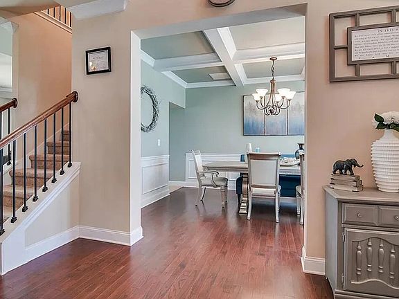 From the moment you step into the foyer, the home impresses with detailed finishes, vaulted ceilings in the library and dining room (large enough to fit a table for 10), and heavy molding with coffered ceilings. The great room is spacious and open to the kitchen, featuring a cozy fireplace. The kitchen is complete with granite countertops, stainless steel appliances, hardwood floors, mahogany cabinetry, a built-in island with bar seating, a breakfast area, and a walk-in pantry.