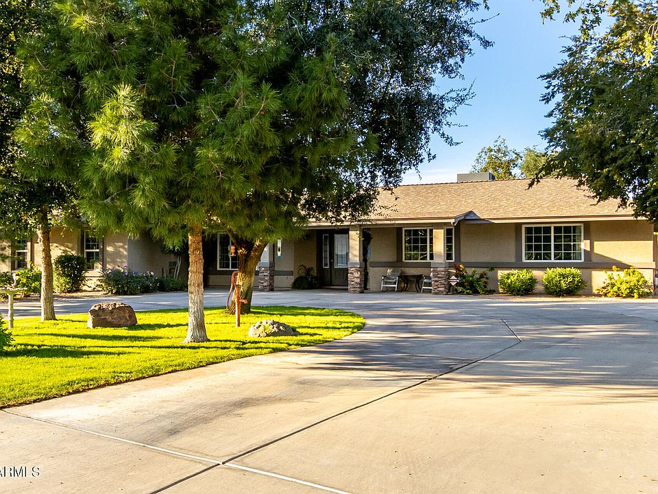 MUST SEE | NO HOA | RV GATES | HORSE PROPERTY | PEORIA GEM - Surrounded by a lush green landscape, this property is tucked away on a quiet cul-de-sac in a highly desired area of Peoria, offering privacy, versatility, and freedom with NO HOA. The home features a new roof, new rooftop AC unit, newer windows, doors, trim, and real 3/4'' hickory flooring throughout. Two 5-ton AC units keep the home comfortable during summer. Enjoy the spacious living area with a wood-burning fireplace. Two 12' RV gates provide easy drive-through access to covered horse stalls with water and electric, plus a lighted arena. The property also includes an oversized 2-car garage with evap cooler, three storage outbuildings, and a full automatic watering system for vibrant landscaping.
