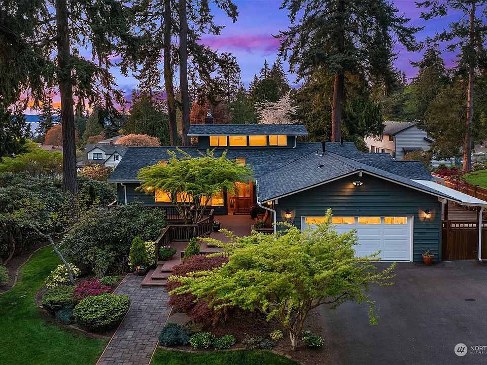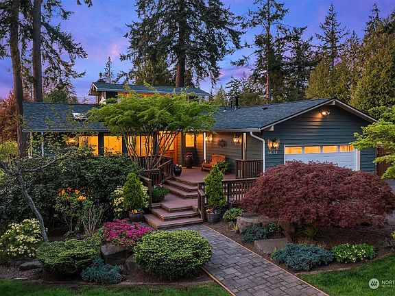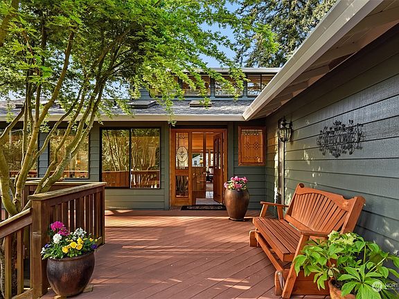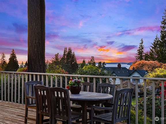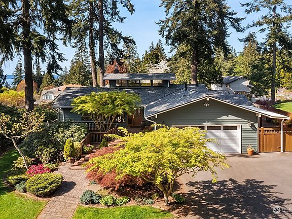 Spectacular NW Contemporary home with views in desirable Seaview. Ideally located at the end of a quiet street, adjacent to green space & blocks to Hutt Park. Stairless access to main level living. Primary on the main with luxe 5-piece bath & walk in closet. Captivating architectural design, vaulted exposed-beam ceilings. The open concept floor plan is perfect for entertaining. Gorgeous chef's kitchen with eating space & light-filled sunroom are the heart of the home. Daylight level with large family room, 3 beds, 3/4 bath & sliders to the fenced backyard. Fantastic outdoor living spaces include the welcoming front deck and the large deck off of the dining & primary w/views of the mountains & Sound. Park-like setting with manicured grounds.