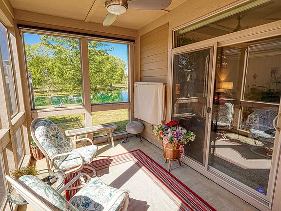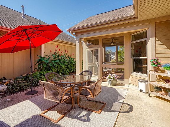 Single story free-standing condo in desirable Seldom Seen Acres. A Portico ranch built by Epcon backs to a community pond & offers amazing sunset views! This well maintained home offers 2 bedrooms, a den with skylight, tray ceilings, transom windows, upgraded trim package with crown molding, engineered hardwood flooring in main living areas & den, a screened porch, private fenced & gated courtyard & a 2.5 car attached garage. This home shows like a model and has updated features including custom light fixtures, custom blinds throughout, newer granite counter tops in kitchen & bathrooms, newer dishwasher, newer carpeting in bedrooms, Elfa closet systems in primary walk in closet and garage, ceiling fan & sunshade in screened porch, with mounted wall TV, and a professionally landscaped courtyard garden with perennials & a custom water feature. The kitchen features white staggered cabinetry with new door hardware, SS appliances including a gas range, granite counter tops, tile back splash, pendant lighting, double door pantry, and a large island with bar seating. The living room features a gas fireplace with mantel, lighted ceiling fan, can lighting, transom windows, custom blinds & views of the beautiful outdoor living space. The mechanical room & laundry rooms are located in the hallway leading to the oversized garage with custom Elfa storage system and attic storage. This gated community offers a clubhouse with fitness room and swimming pool, and irrigation.