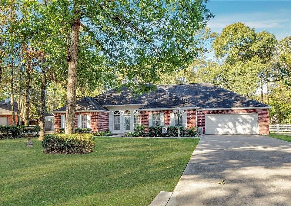 Impressive custom built 4 bedrom 2 bath on nearly half-acre lot in the Highly Sought-After Neighborhood of Carriage Hills with towering trees and the serenty of peaceful living, A-rated schools, including The Woodlands HS. Open and bright split floor plan private master en-suite bath, walk-in closet. Chefs delight eat-in kitchen, breakfast bar, and lots of storage and counter space. Elegant formal dining and entry to a great family room opening to backyard with a large deck, perfect for entertaining or enjoying the peaceful privacy. Additionally, there is a storage bldg with electricity that can be used as a workspace or additional storage. Over size 2 car garage with large secret climate controled closet. The Carriage Hills community offers basketball, playground, pool, and pond for fishing. Conveniently located within minutes of I-45, you'll have easy access to all that The Woodlands, Magnolia, and Conroe have to offer. This home and community truly has it all. Tour today!