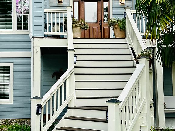 Beautifully updated, well-maintained home 3500+ square feet in a waterfront community with an assigned 25 foot boat slip. Home features include Inclinator hydraulic elevator, security system, irrigation, Kinetico water filtration system. Custom engineered home on pilings foundation plus grade beam system and cement board siding. New, wood-look fiberglass door installed in 2024. Circular driveway with extensive parking. Oversized 2 car garage + bonus space for workshop/hobby area. The interior has 4 bedrooms, bonus room, and 4.5 baths. Oak hardwood floors throughout the main living area and kitchen. Open floorplan with plenty of room for entertaining. Updated kitchen with large island, quartz counter tops, built-in wine cooler, and gas cooktop with oversized nautical light fixtures. New oven-microwave wall unit (2024) as well as a large walk-in pantry. Breakfast Nook plus a formal dining room. Updated primary bathroom with double quartz vanities, soaking tub, European heated towel warmer, large glass shower and separate water closet/toilet. Two walk in closets in the primary bedroom. Upper level porch is accessible from the primary bedroom and the laundry room. Third floor laundry room has a deep utility sink, storage cabinets, and mounted folding drying rack. Third floor offers two additional bedrooms which share a Jack-and-Jill bathroom. Guest bedroom with ensuite bath on main living level. The ground level has a large bonus room with ensuite bathroom and Living Room. Fenced in back yard with custom fireplace, pergola, and protected bar entertaining area. Large deck on front and back of home. HOA dues include clubhouse, pool, and dock/gazebo, assigned boat slip on the Intracoastal Waterway, internet and tv cable. Owner is licensed NC Realtor.
