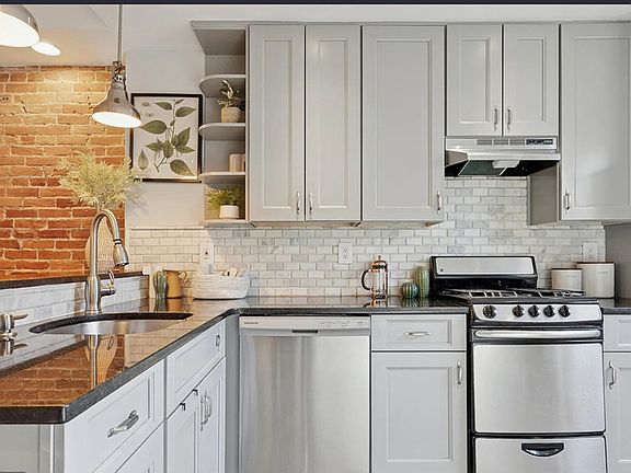 Quartz countertopsShared basement storageIn-unit washer and dryerExposed brick accentsCozy breakfast nookCustom backsplashVintage black-and-white tiled bath