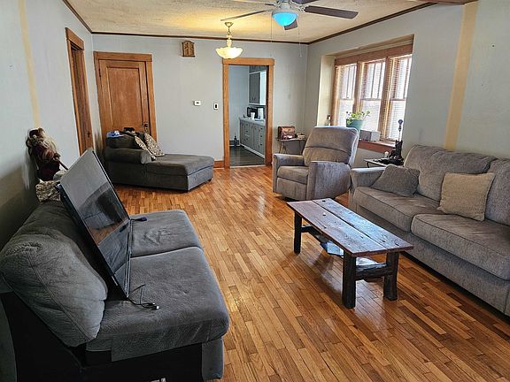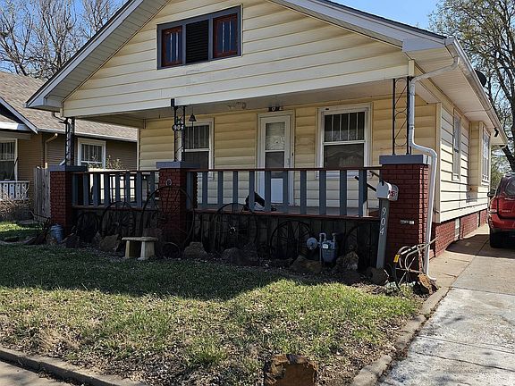 Charming bungalow with updates throughout. 2 main floor bedrooms plus and additional basement bedroom with egress. Updated bathroom and hardwood floors in living and dining area. Front porch decking and rails recently updated. 2 basement rooms in basement that can be used as a workshop or for storage. Wagon wheels front of house do not remain