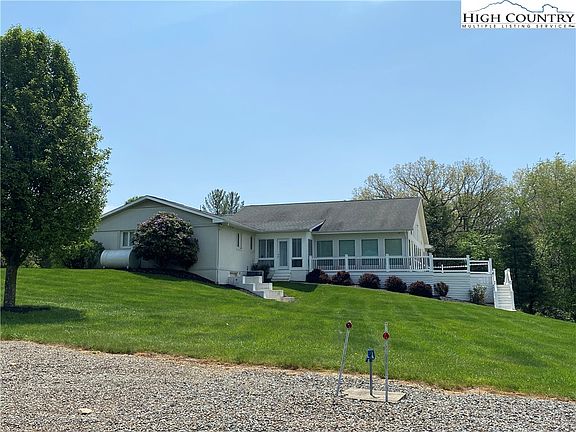 Must see! Make this beautiful, spacious ranch style home yours. 1 level living. Grand Living Room with vaulted ceiling and fireplace. Sunroom off Living Room. Large Kitchen, Dining, area with wood burning fireplace & Breakfast Area. Cultured marble countertops in Kitchen and Baths. Large Master Suite with fireplace, 2 large walk-in closets, full bath, dressing area. Master Suite is at opposite side of house from 2 guest bedrooms and has access to deck from MB. 2 Large office areas. Good for work from home. Spacious wrap around deck for entertaining. Over-sized attached 4 stall garage with black and white tile floor and a wall of mirrors. Borders Little River, stocked with trout by the state. Fish from backyard! Listen to soothing sound of water rippling by. Mature landscaping, beautifully maintained yard. Walk-out basement. 2 Separate detached garages, and machine shed, could be used for shipping if dock is added. Near Blue Ridge Parkway and Stone Mountain, minutes from Sparta. 9 large truck bays, a lot of storage space and workshop areas. Convenient to local rifle range.