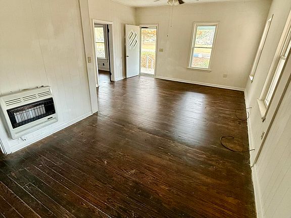 Solid 3-bedroom, 1-bath home featuring hardwood floors and an open living room and kitchen layout with a bar. The home includes a separate laundry room with washer and dryer remaining. Front and back porches provide additional outdoor space. Property also includes a storm shelter and a detached garage/shop, offering extra storage and workspace. A functional home with practical features ready for it to be your home. Call and make your appointment .