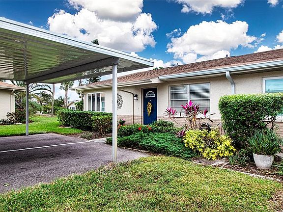Welcome Home! This meticulously maintained home in the gated section of Sun City Center known as Kings Point is ready for you. The Oxford floor plan features 1128 sq feet of living space with 2 bedrooms, 2 bathrooms, dining room, large living room, enclosed ( and under air) Florida Room with large utility room ( also under air ), with covered parking and guest parking as well. Your inviting living room with plenty of space for guests has beautiful laminate floors, lighted ceiling fan and double window with blinds. The kitchen has laminate flooring, raised ceiling with recessed lights and a ceiling fan, extra custom cabinets, pass through window, stainless steel appliances ( $500 credit at closing to add a new range), stainless double sink and disposal with gooseneck faucet with sprayer, tile backsplash and vented fan into the attic. The dining room sits just outside the kitchen and fits a dining table with 4 chairs, laminate flooring and chandelier with dimmer. The enclosed Florida room is perfect for a den with the floor leveled for a continuous flow, wrap around windows with vertical blinds to let in the light, ceiling fan with lights and a side door to access the yard with its park-like setting. The utility room is under AC as well, (an additional 184 st ft under air, not added into the living sq ft), it has double doors to park your golf cart, houses a full size washer and dryer, water softener, extra refrigerator, pull down stairs to the attic ( for more storage) and still has room for storage shelves and a workbench. Down the hallway the laminate floors flow, it has a chandelier and an ample linen closet. The master bedroom is large enough to accommodate a king size bed, with a walk-in closet with extra shelving, ceiling fan. large window with blinds, carpet and ensuite bathroom. The ensuite bathroom has an updated tiled walk-in shower, custom vanity, newer lights, faucets, mirror, grab bars and tile floor. The second bedroom is currently being used as a TV room and is spacious enough for your guests with a built-in closet, large window with blinds, carpet and ceiling fan. The guest bathroom also has updated vanity, lights, mirrors, a tiled tub/shower, grab bars, and tile floor. The interior of the home has been recently painted including the doors and frames and the utility room walls and floor. All this and an updated electric panel box, HWT in 2019 and HVAC in 2015. Kings Point boasts 2 clubhouses in this fabulous 55 and older community, each with an outdoor heated pool, indoor pool, exercise room, craft rooms, large screen TV, bar, food service, planned social activities and so much more. Maintenance includes building exterior, premium cable, internet, escrow reserves fund, ground maintenance, private road, recreational facilities, roof, security, water and sewer. Close enough to I75 to enjoy all Tampa Bay has to offer. Call for details!