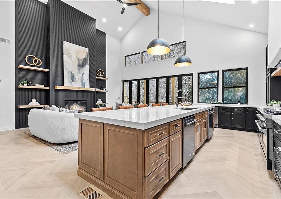 Spring is the perfect time to start fresh in a stunning new home! Welcome to 904 Kings Court in the vibrant Morningside neighborhood—a modern farmhouse crafted for those who love to entertain and impress. Enter through the striking glass pivot door and stroll down a wide hallway past a stylish floating staircase. You'll find yourself in a grand 21-foot high great room filled with natural light, featuring a chef’s kitchen with a 12-foot island, double dishwashers, wine and beverage fridges, and a 48-inch gas stove. Hosting is easy with a 60-inch fridge/freezer, walk-in pantry, and a scullery with a convenient pass-through to the dining room. Slide open the 16-foot bifold doors to a spacious deck with a gas fireplace overlooking a serene and private wooded backyard. The main floor offers a rare primary suite with a spa-like bath, vaulted ceilings, a zero-entry shower, and a soaking tub. The roomy walk-in closet even has space for a washer/dryer. Also on this level are a powder room, a second bedroom with an ensuite bath, and a versatile bonus room. Upstairs, the elegant floating staircase leads to two bedrooms with ensuite baths. One is a junior suite with dual closets and a luxurious bathroom, while the other is cozy with a window seat and a large walk-in closet. The lower level is all about fun, featuring a huge rec room, a home theater, a separate laundry with a dog wash, and a spacious bedroom with a full bath. Outside, enjoy the expansive lot with a creek and a historic stone fireplace. Located at the Morningside-Virginia Highland border, you're close to coffee shops, dining, and shopping. With easy access to Ponce City Market, the Beltline, Piedmont Park, and more, plus pre-wiring for EV charging, this home offers exciting city living at its finest! Note that the pool is a conceptual rendering and buyer to do their own investigations.