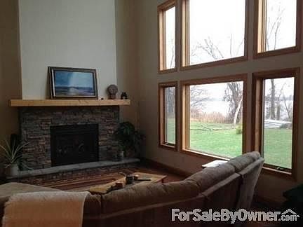 PRIME LOCATION! UPGRADES GALORE! This lake home has granite countertops, hardwood floors, dual-sided fireplace, master bedroom walk-in closets, and a wide open floor plan perfect for entertaining! As you walk into the home, you gaze out the 2-story windows with perfect lakefront views as they give natural light throughout the home. The great room has beautiful cherry hardwood floors and vaulted ceilings. The kitchen boasts stainless steel appliances, a large island, walk-in pantry, a built-in wine refrigerator, gas Jenn air cooktop, and indoor grill. You enter through french doors to the main floor master bedroom and continue to the master bathroom through arched doorways. Dual sinks, a jetted jacuzzi tub, tiled shower and water closet will make you feel as you have entered your very own spa. Upstairs contains 2 bedrooms connected by a catwalk that allows for more unobstructed views of the lake. A full bathroom and office space also compliment the living quarters upstairs. The daylight basement has been newly finished within the past 9 months complete with knotty pine from top to bottom and carpeted floors to give a nice cabin feel. The wide open floor plan allows for a game room and family room and an additional bedroom is fashioned to allow for a media room complete with wiring required for a sound system. There is an additional unfinished bedroom and unfinished bathroom (plumbing already in place) that an owner may choose to finish at a later date, turning the structure into a 5 bedroom home! The home is trimmed in poplar and wrought iron spindles. The garage is 2 wide with one side extra long to allow for an additional vehicle or boat. There is also a roll up door on the backside of the garage to allow easy access to the backyard for a lawn mower. The backyard is complete with stairs to the lake and a cement patio with fire pit to allow for outdoor entertaining. Across the street from the home is a brand new park that the subdivision has built within the last year, and the community walking trail is only steps away! With spring around the corner and boating season soon upon us, don't miss out on the opportunity to make this beautiful home your own!Additional property info: http://www.forsalebyowner.com/listing/4-bed-Log-Cabin-Home-for-sale-by-owner-904-Lakeview-Rd-56055/23979152?provider_id=28079