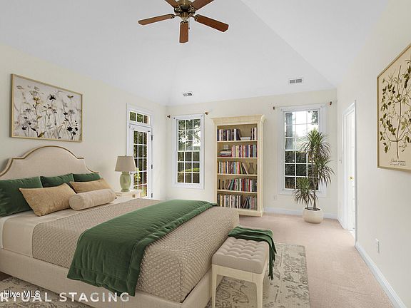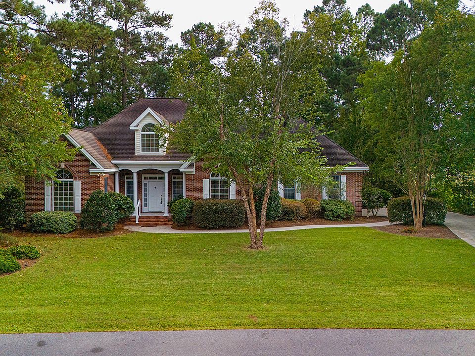 This stately brick home in Brandywine Bay enjoys a prime setting along the golf course and offers both comfort and versatility. The inviting two-story foyer sets the tone, leading into a spacious living area with vaulted ceilings, built-ins, and a cozy fireplace that flows seamlessly into the kitchen. Designed with both function and style in mind, the kitchen features warm wood-toned cabinetry, a center island with seating, and a breakfast area, while a formal dining room with wood floors is ideal for special gatherings. A sunroom with skylights and direct access to the patio provides a relaxing spot to enjoy golf course views. The split floor plan places the primary suite just off the kitchen and laundry area, complete with a walk-in closet and a bright ensuite highlighted by skylights, dual vanities, a soaking tub, and a separate shower. Three additional guest bedrooms and a full bath are located off the main living area, offering comfort and privacy. Upstairs, a versatile bonus room is perfect for movie nights, a play area, or gaming, with an adjacent hobby or office area and convenient access to a floored attic for extra storage. This home blends spacious design, thoughtful features, and an unbeatable golf course location.