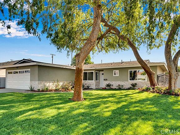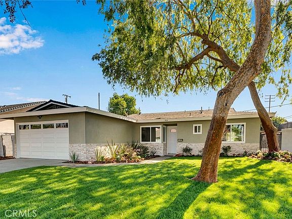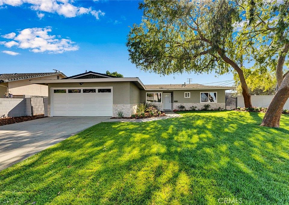 Welcome to this beautifully renovated single-story ranch-style home that combines modern updates with timeless charm. Step inside to find new windows, stylish light fixtures, and fresh finishes throughout. The heart of the home features a fully updated kitchen with stainless steel appliances and a cozy breakfast nook, while the dining area flows smoothly into the living room, complete with a tiled accent wall and fireplace. Both bathrooms have been thoughtfully remodeled, and one of the bedrooms is perfectly situated at the front of the house for privacy or a home office. Outside, enjoy the freshly landscaped front yard with new sod and vibrant flowers, plus a new concrete driveway leading to the attached 2-car garage. The expansive backyard is a blank canvas ideal for a future pool, garden, or outdoor entertaining space. A mature grapefruit tree, block wall fencing, and a covered patio spanning the back of the home provide shade, privacy, and plenty of potential. This move-in ready home truly has it all: modern upgrades, functional layout, and a yard that invites your imagination. ***Added Bonus*** New roof will be installed before the close of escrow!!