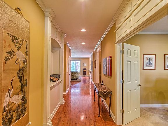 Delightful custom home w/gleaming hardwoods & open floor plan. Great room w/built ins. Master suite w/full shower, double sinks, large WIC. 2other bdrms on main (one=office). Kitchen w/Corian counters, bfast bar, bfast nook PLUS a great sunroom as well! Fenced backyard beautiful landscaping & calming views will give you the peace you desire. Basement w/full custom bar, additional bdrm, full bath, & space for games&movies. Custom window treatments. HUGE walk up attic storage above garage too!