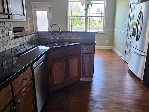 Stone fireplacePrivacy-fenced backyardStunning hardwood flooringArched entrywaySitting roomBreakfast barAmple closet space