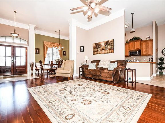Beautiful custom built home in demand area & schools ~ spacious, open/split floor plan 4bed/2bath, wood floors in main area and in dining room, tile in foyer, kitchen, baths & carpet in bdrms, wood burning fireplace, SS Appl. Primary bath features, dbl vanity, walk-in shower, jetted tub and two walk-in closets, fans throughout. Lrg covered and uncovered patio w/ huge backyard, new fence. 2 car garage / extra wide driveway w/ parking pad. Never flooded, flood zone C. Quiet area ~ GREAT LOCATION ~ A MUST SEE!